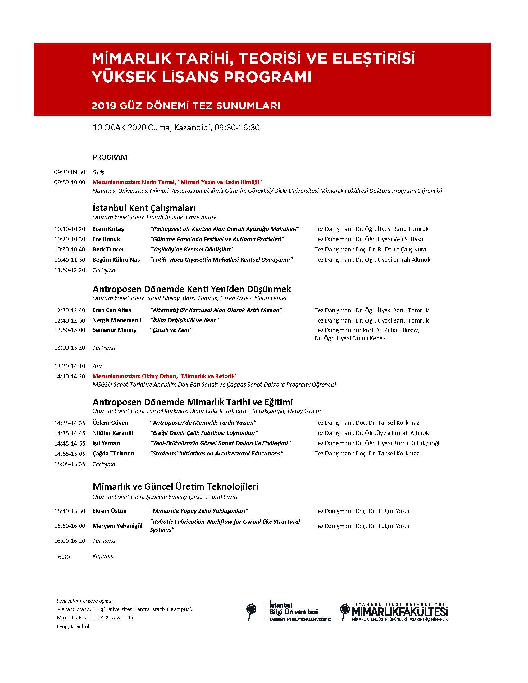 2019-2020 Güz Dönemi’ni kaparken, sizleri bu sene üçüncüsünü düzenleyeceğimiz Mimarlık Tarihi, Teorisi ve Eleştirisi Tezli Yüksek Lisans Programı Öğrenci Tez Sunumları’na bekliyoruz.