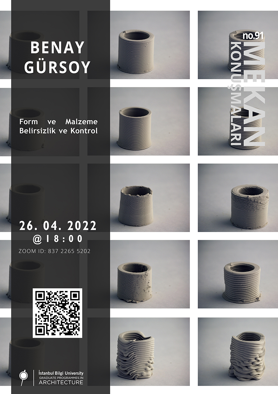 İstanbul Bilgi Üniversitesi, Mimarlık Yüksek Lisans Programları öğrencilerinin düzenlediği Mekan Konuşmaları serisinin 91.sinde "Form ve Malzeme Belirsizlik ve Kontrol" başlıklı konuşması ile Benay Gürsoy konuğumuz oldu. Benay Gürsoy ve ekibi, Penn State Üniversitesi'nde Gürsoy’un kurup yönettiği ForMat (Form and Matter) Lab’de, yapma eyleminin tasarıma dahil olduğu durumların, sayısal tasarım düşünce ve pratiklerine entegrasyonunu araştırmaktadır. Mevcut araştırmalar, uyarlanabilir dijital üretim (adaptive digital fabrication) ve miselyum (mycelium) bazlı yapı bileşenlerinin ve strüktürlerin tasarımı ve üretimini içerir.