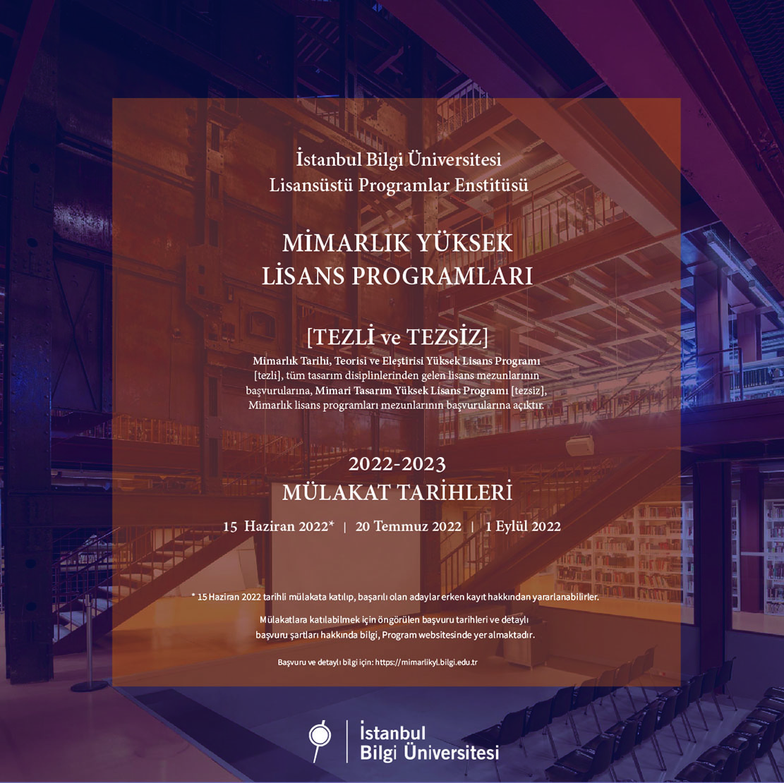 Bilgi Üniversitesi Mimarlık Yüksek Lisans Programları 2022-23 Akademik Yılı başvuruları başlamıştır. Başvuru koşulları, istenen belgeler ile tarihleri, programlarımızın websitesinin ilgili alanlarından öğrenebilirsiniz.