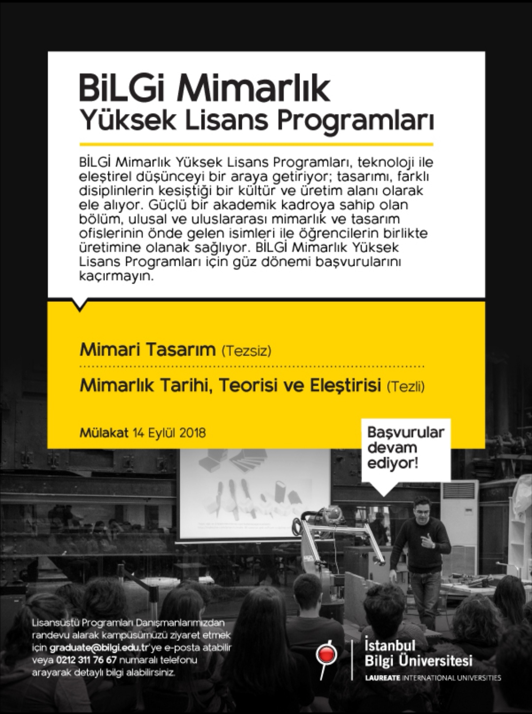 Istanbul Bilgi Üniversitesi Mimarlık Yüksek Lisans Programları'na başvurular devam ediyor.... Mimarlara, tasarımcılara ve farklı disiplinlerden gelen meslek sahiplerine açık olan tezli ve tezsiz yüksek lisans programları tasarımı farklı disiplinlerin bir araya geldiği bütünleşik bir kültür ve üretim alanı olarak ele almakta; coğrafi ölçekten bireye, kentsel ölçekten nesneye, mimari mekandan ürüne uzanan geniş bir yelpazede farklı tasarım paradigmalarına odaklanmaktadır. Nesneye, mimari mekana, kente, peyzaja, doğaya ve gündelik hayata dair insan pratiklerinin oluşturduğu örüntüleri tasarım kültürünün içinde sorgulamayı amaçlamaktadır. Programda yürütülen çalışmalar, bir yandan eleştirel düşüncenin oluşum biçimlerini; diğer yandan da tasarım kültürünün teorik altyapısını sorunsallaştırmaktadır. Istanbul Bilgi Üniversitesi Mimarlık Yüksek Lisans Programları, tasarım teknolojilerini ve üretim biçimlerini yaratıcı ve eleştirel düşünce ile birlikte ele alarak, eleştirel teori ile beslenen bir tasarım araştırmaları zemini kurmayı hedeflemektedir.
