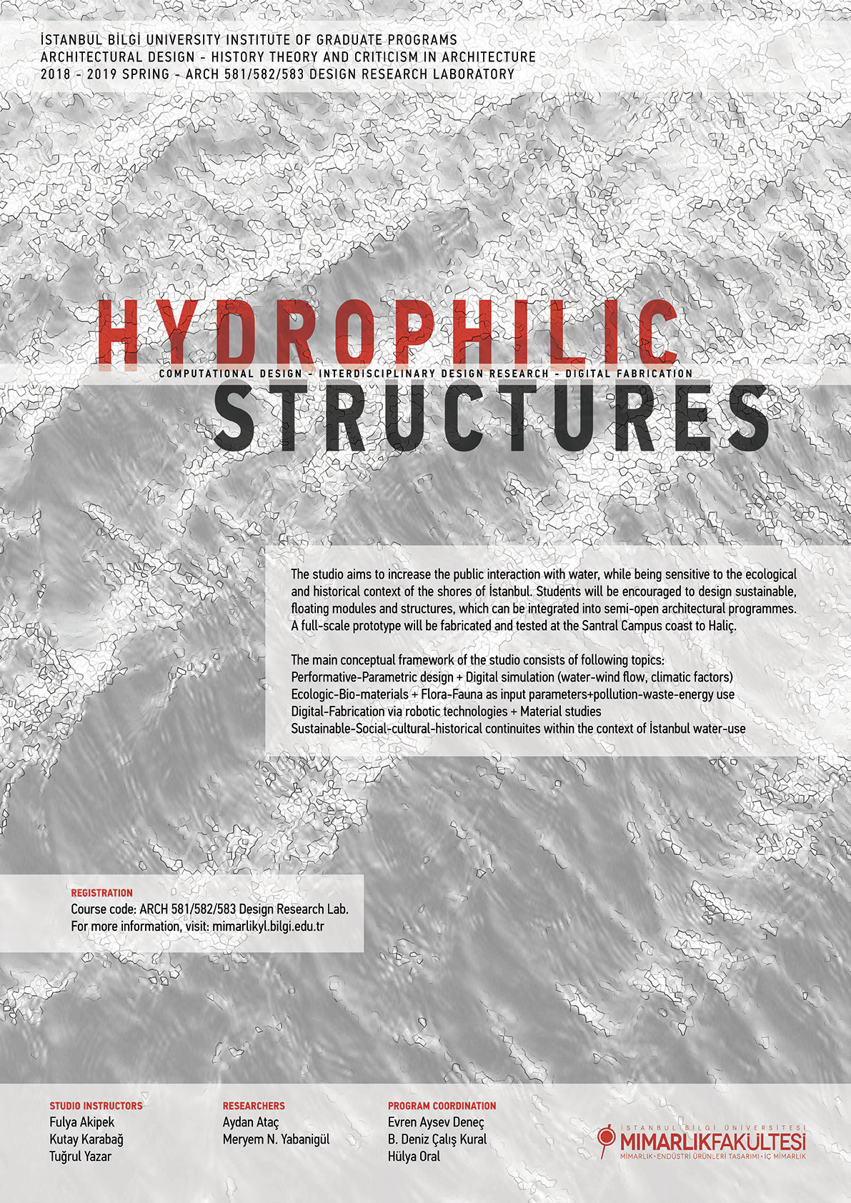 Bu stüdyoda tüm bu farklı mimari yaklaşımlar arasında, öncelikle bir su kentinde suyla etkileşimi ve kamusallığı arttıran açık alan strüktürleri kurmak hedeflenmekte. Su ve hava akıntılarıyla etkileşim, yüzebilme performansı, bu dinamiklere cevap verecek materyal ve form araştırmaları gibi konular sayısal tasarım ve üretim teknolojilerinin kullanımını teşvik etmekte. Bu yaklaşım içinde performans ölçümleri için kullanılabilecek sayısal benzetim ortamları, ya da robotla kalıp yapım teknolojileri dersin araştırmaları içinde yerini alacak. Tasarım araştırmalarının önemli bir ayağı da ekolojik nişler olacak; insan konforunun yanı sıra mevcut flora- fauna ile birlikte döngüsel yaşam senaryoları kuran ya da malzeme araştırmalarında biyo-malzemeler gibi disiplinler arası araştırmalarla ilerleyen çalışmalar yapılabilir.
