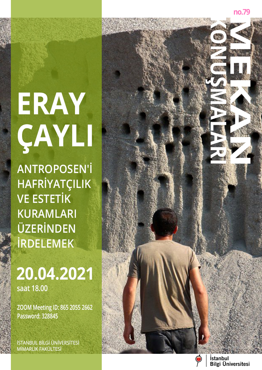 İstanbul Bilgi Üniversitesi Mimarlık Yüksek Lisans Programları öğrencilerinin düzenlediği “Mekân Konuşmaları” dizisinin 79.cusunda London School of Economics’den Eray Çaylı bizlerle olacak. Konuşma, antroposen diskurunu alışılmışın dışında bir pratikle inceleyen Çaylı’nın geçtiğimiz aylarda yayınlanan İklimin Estetiği: Antroposen Sanatı ve Mimarlığı Üzerine Denemeler kitabının devamı niteliğinde, “Antroposen'i Hafriyatçılık ve Estetik Kuramları Üzerinden İrdelemek” üzerine olacak.