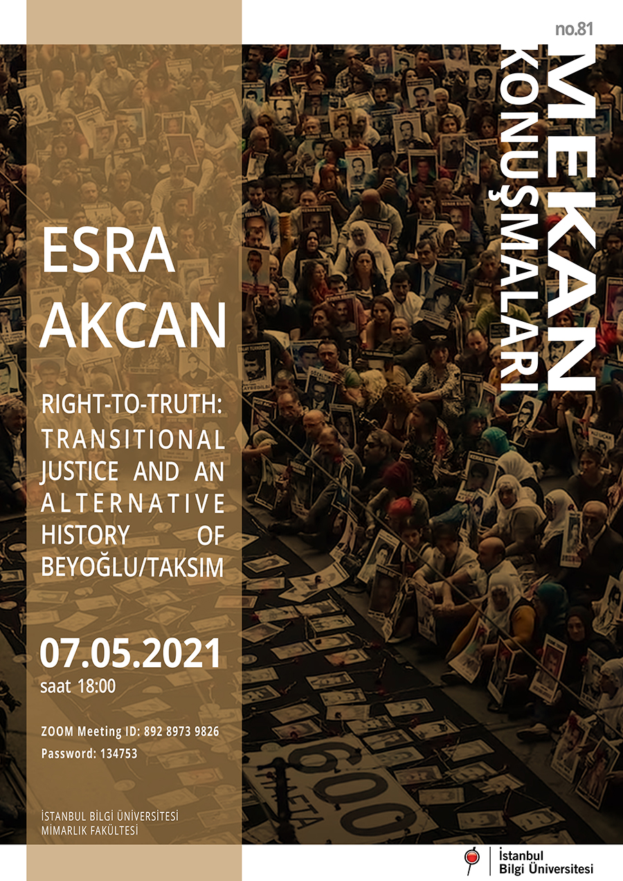 İstanbul Bilgi Üniversitesi Mimarlık Yüksek Lisans Programları öğrencilerinin düzenlediği “Mekân Konuşmaları” dizisinin 81.sinde Cornell University’den Esra Akcan bizlerle olacak. Yalnız Cumartesi Anneleri ve Galatasaray Meydanı özelinde değil, dünyanın pek çok yerinde benzer umutlarla mekânlaşan hakikat ve hak arayışlarını izleyen Akcan’ın konuşma başlığı “Hakikat Hakkı: Geçiş Adaleti ve Beyoğlu/Taksim’in Bir Diğer Tarihi”. Gelin, birlikte tartışalım.