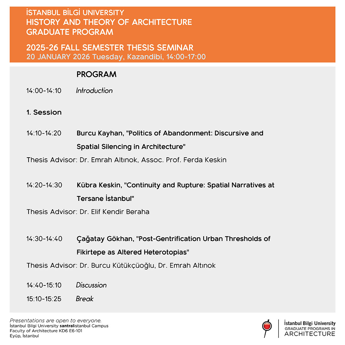 Hava muhalefeti sebebiyle etkinlik 20 Ocak 2026 Salı günü 14.00-17.00 olarak ertelenmiştir. İlgilenen tüm hocalarımızı ve öğrencilerimizi bekliyoruz. Mimarlık Tarihi ve Kuramı 25-26 Güz Dönemi Tez Semineri , Mimarlık Tarihi ve Kuramı Yüksek Lisans Programı öğrencilerimizin çalışmalarını sunacakları Yüksek Lisans Tez Çalışmaları Semineri’nin sekizincisi 20 Ocak 2026 Salı günü 14.00-17.00 arasında Kazandibi’nde gerçekleşecek. Seminerin amacı öğrencilerimizin tez çalışmalarında neler yaptıklarını öğrenebilmek, birbirimizden haberdar olmak ve bir paylaşım ortamı yaratmaktır. Sunumlar, herkese açık olarak gerçekleşecektir. Sunum detaylı program için posterimizi inceleyebilirsiniz.