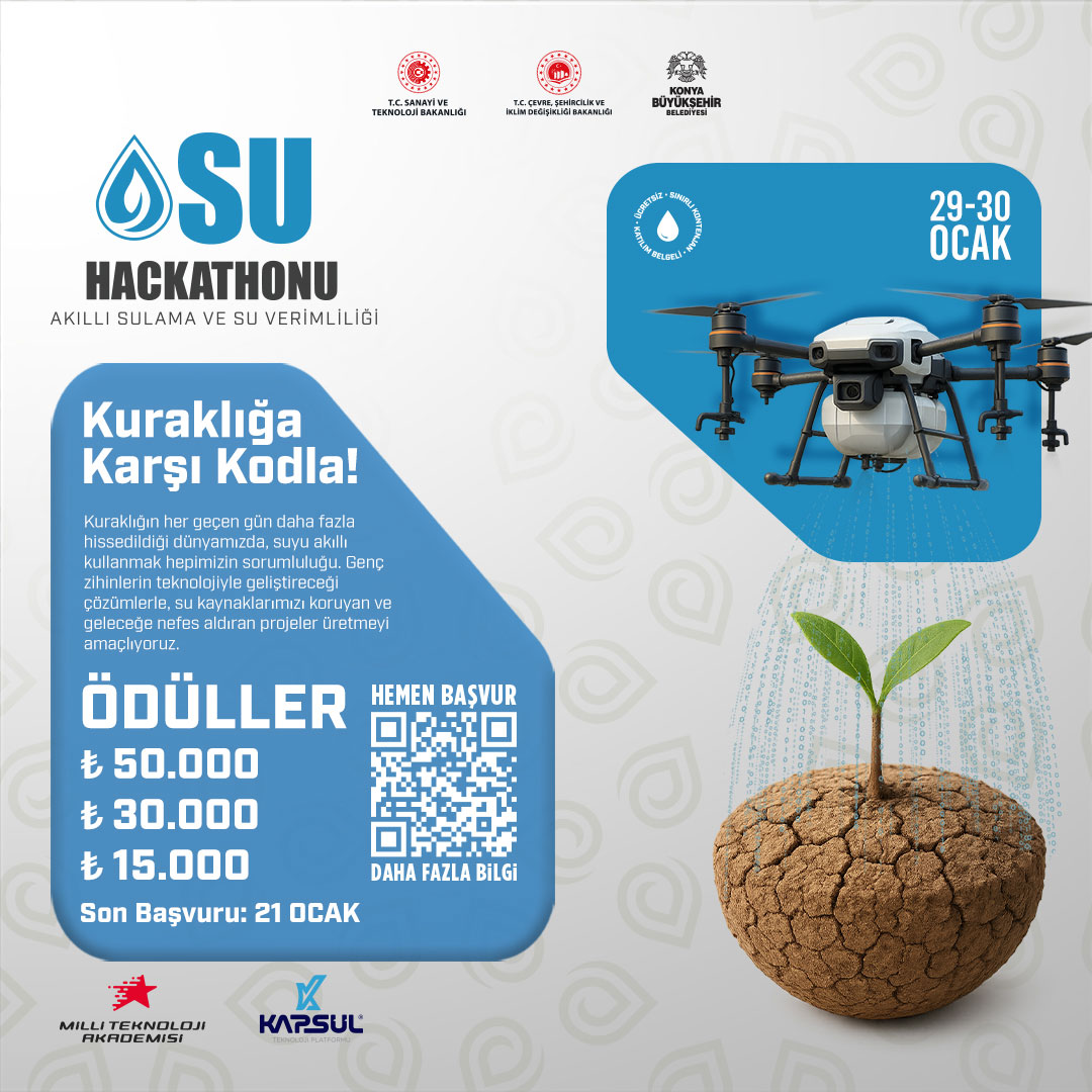 Büyükşehir Belediyesi Kapsül Teknoloji Platformu iş birliğiyle 29–30 Ocak 2026 tarihlerinde Konya’da Su Hackathonu düzenlenecektir. Hackathon süresince katılımcı takımlar, alanında uzman mentörlerden teknik ve akademik destek alarak projelerini geliştirme imkânı bulacaktır. Etkinlik sonunda dereceye giren takımlar ödüllendirilecek, başarılı ve yenilikçi projeler ise ticarileşme ve geliştirme süreçlerine yönelik önemli fırsatlar elde edecektir.